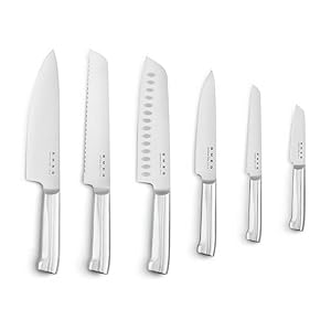 SET INCLUDES: Vegetable Knife 3-Inches,Utility Knife 5-Inches, Meat Knife 5.9-Inches, Santoku Knife 7-Inches, Bread Knife 7.48-Inches, Chef’s Knife 7.48-Inches and 6-Slot acacia wood Knife Block